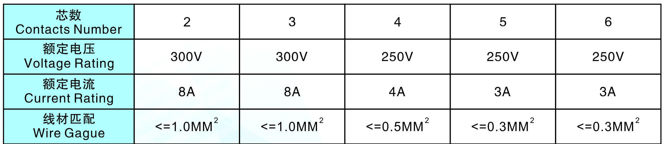 線材匹配(Wire  Gague):     <=1.0MM2       <=1.0MM2    <=0.5MM2      <=0.3MM2      <=0.3MM2
